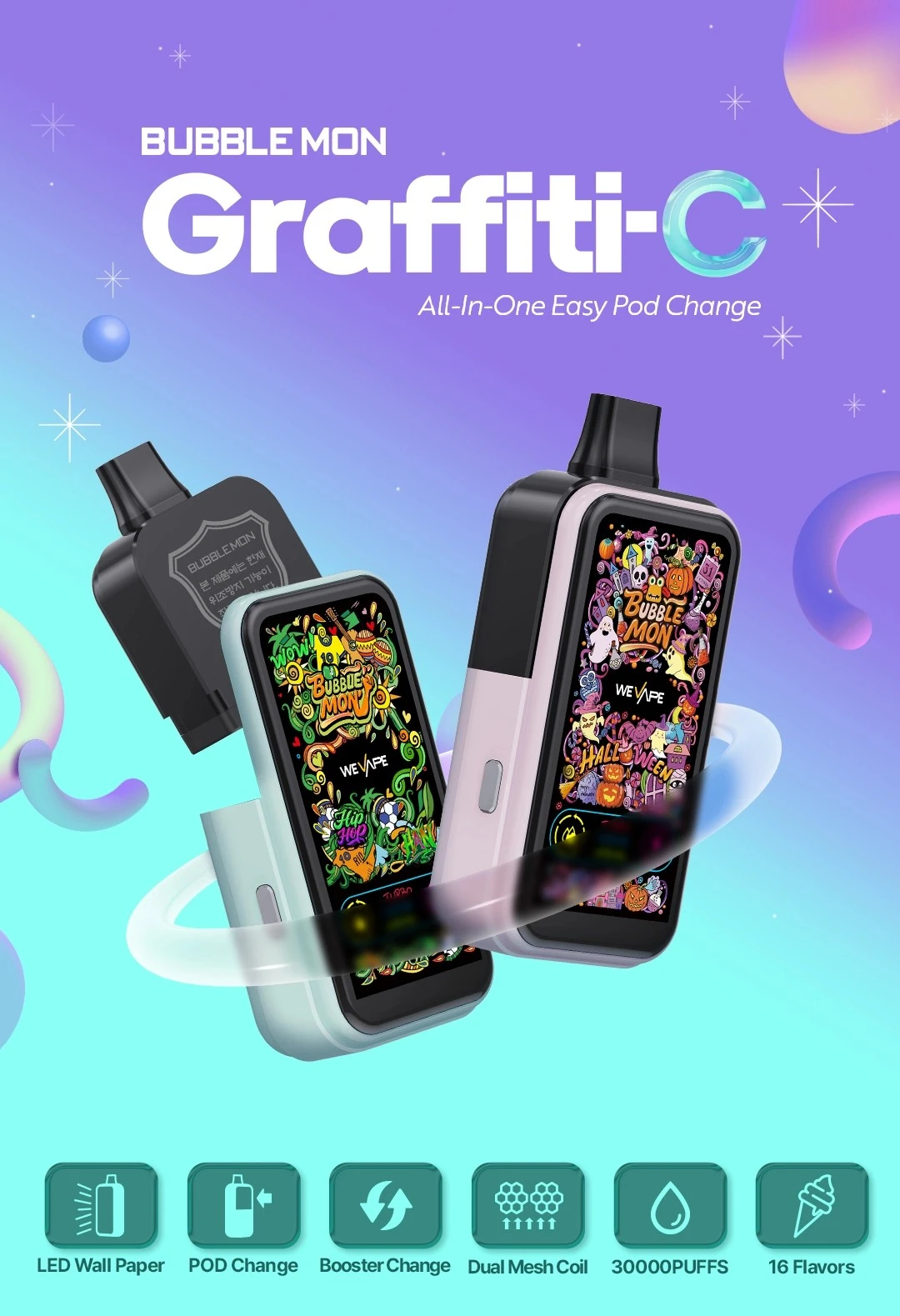 Bubblemon炫彩三代30000是一款主打高口数与可换弹设计的电子烟设备,整体配置偏向实用与可玩性兼顾,适合对续航、显示效果和口味选择有要求的用户。作为一款标称30000口的设备,它在结构和功能上相比常规一次性产品更加成熟。