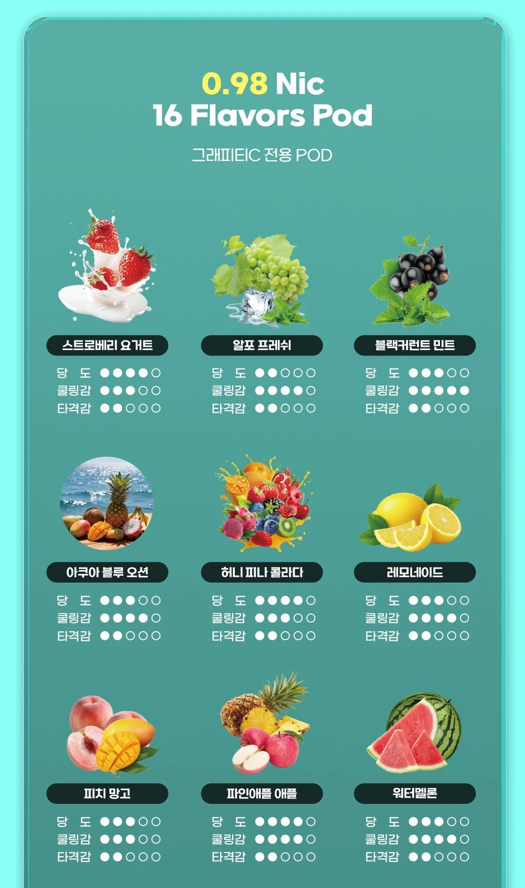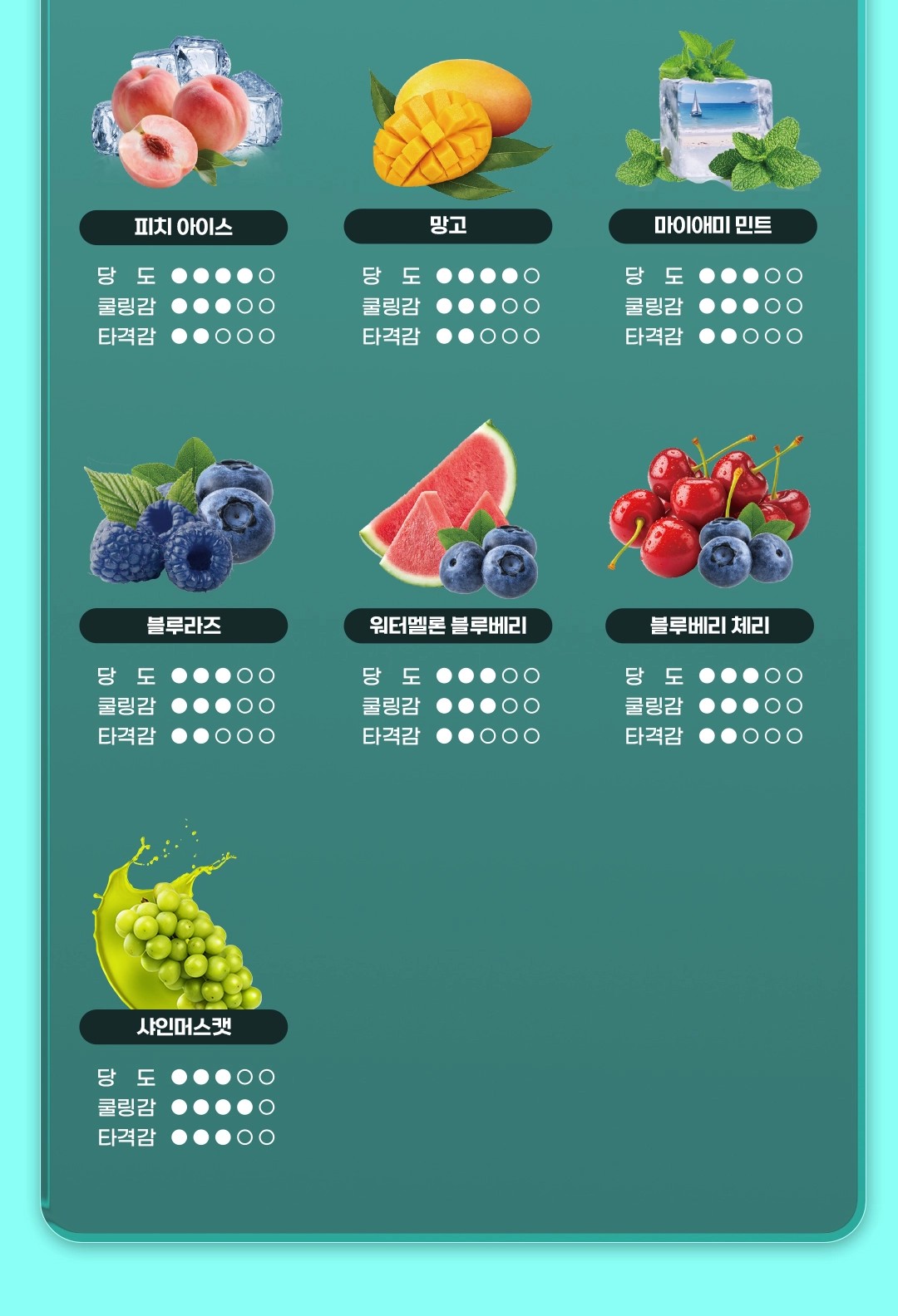 口味选择覆盖范围广,包括草莓酸奶、芦荟葡萄、黑加仑薄荷、蓝色海洋、柠檬、桃子芒果、菠萝苹果、西瓜、桃子冰、芒果、薄荷、蓝莓、蓝莓西瓜、蓝莓樱桃、青提、蜂蜜椰林飘香,多数为清爽或果甜取向,适配不同使用偏好。